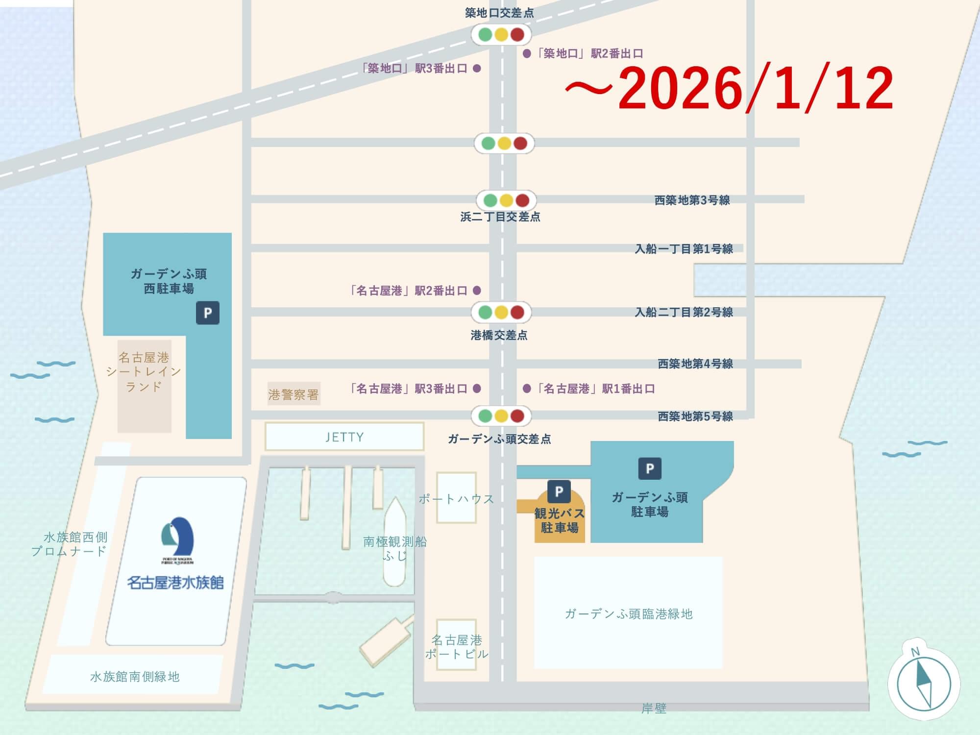 水族館前には乗降スペースはありません。お車は水族館から徒歩5分のガーデンふ頭駐車場等にお駐めください。