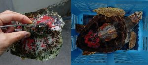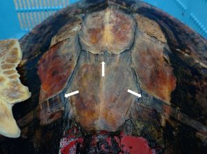 甲羅の色が明るい部分が送信機の装着跡。レジンで覆われていても甲羅の成長には影響していないことが確認できました。