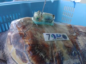 567日で脱落した模擬送信機とアカウミガメ(個体番号:5333 3歳5か月齢)