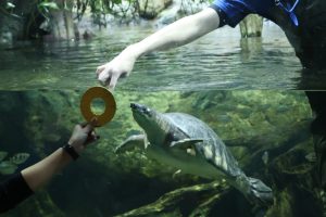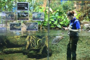 南館3階「オーストラリアの水辺」で飼育しているブタバナガメ(個体番号Cm10-4)のトレーニングを行っています。トレーニングでは、ブタバナガメの形態的な特徴を見やすくするための動きや、健康管理に役立つ行動を自発的に行えるように誘導しています。トレーニングは週3回、ミニトマト、バナナ、鶏肉、レバーといった普段の餌をごほうびとして与えながら行っています。トレーニングを通して、エサの好みや、まだ知られていない能力などを発見していきたいと思います。