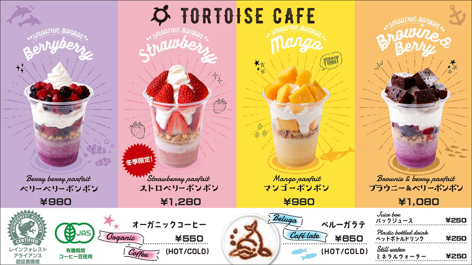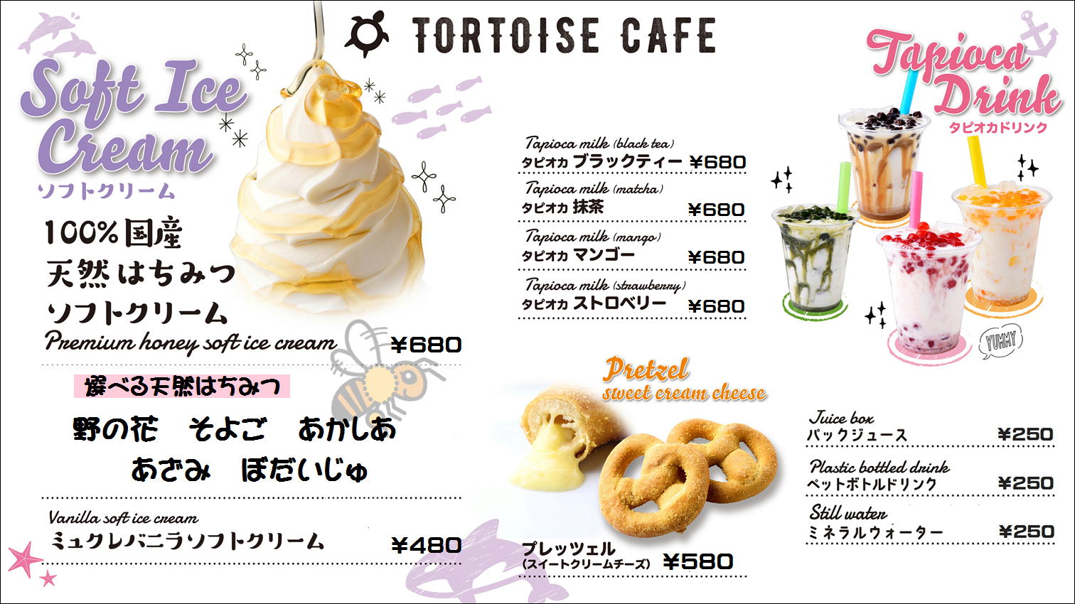 名古屋港水族館限定のベルーガをかたどった「ベルーガラテ」、濃厚なソフトクリームに選べるハチミツをトッピングした「100%国産天然はちみつソフト」などここでしか味わえないカフェメニューでホッとひとやすみ。