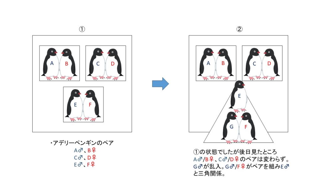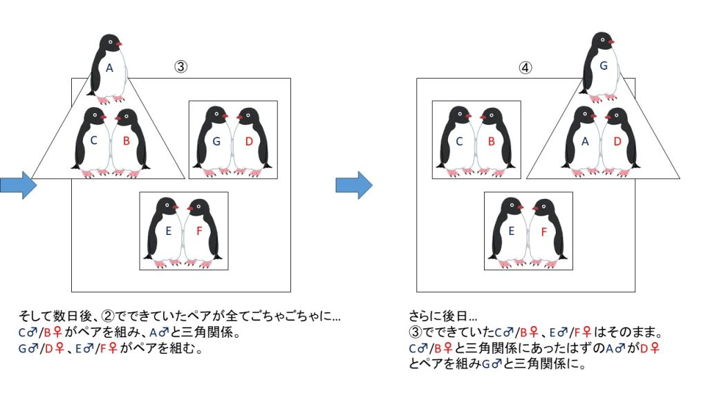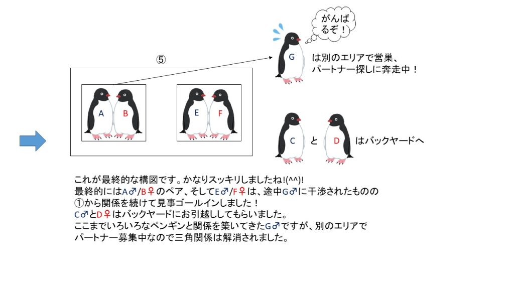①と②まではまだ、「今年も不倫やら三角関係やらドロドロしそうだな~」と見ていましたが、③くらいからぐちゃぐちゃし始めたのでコラムにしてみました。G♂がなんと3羽のメスペンギンに猛アタックしてDエリア抗争を巻き起こしていたのが印象的でした(笑)。