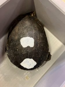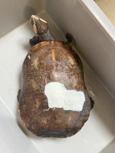 その理由は、夜中に行われるニシキマゲクビガメの産卵行動を監視カメラによる録画映像で確認した時に「いつ」「どの個体」が産卵したか分かるように甲羅にマーキングしているという訳なんです。