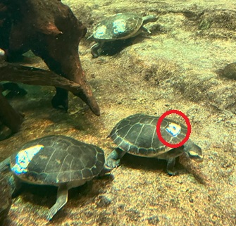南館3階「オーストラリアの水辺」で飼育しているニシキマゲクビガメの甲羅に一部白いマークがあります。