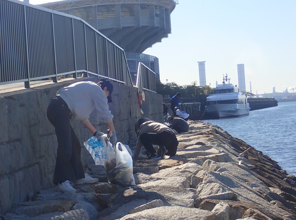 続けて海洋ごみ清掃の方法の説明。今回は、「ヒトが作り出したごみ」を回収します。木の枝や葉っぱは対象外です。各自の清掃の担当場所(効率よくするために)を事前に割り振ります。清掃場所は水族館西側の石積み防波堤です。みなさん、手には日本水族館協会からいただいた軍手(漁網由来原料使用)をはめ、左手にはやはりいただいたごみ袋、右手には武器となる火ばさみをもって担当場所に散らばります。ひとりごみ袋(30㍑)2袋を目安にスタートです。みなさんが回収するごみのほとんどはやはりプラスチック製品です。ペットボトル、ポリ袋、食品トレーの切れはし、梱包用のPPバンド・・・それぞれのごみ袋がみるみる膨らんでいきます。