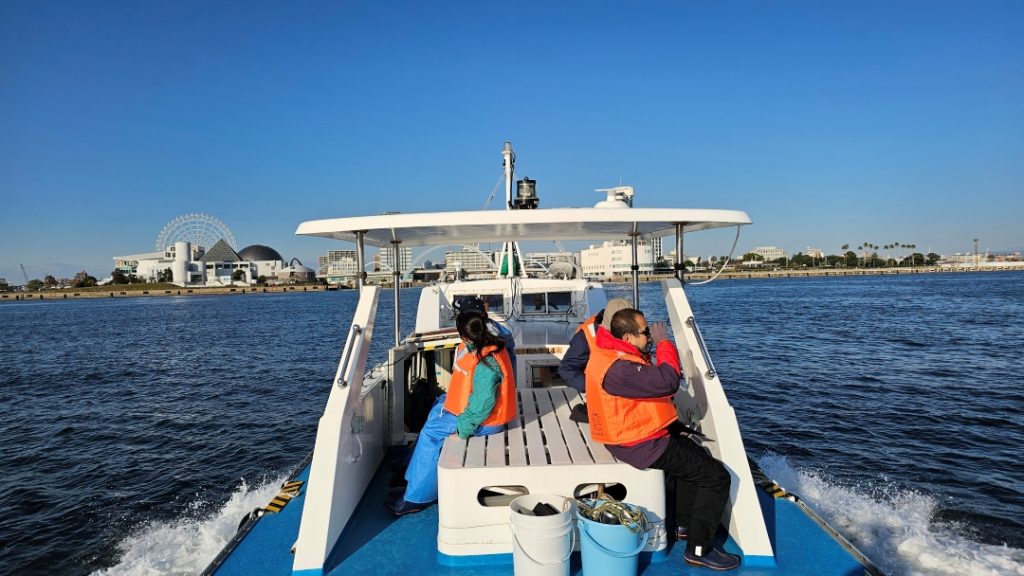 (残念ながらスナメリの写真はありません…こちらは帰港直前の調査メンバーの写真です。最後は少し風が強くなり、寒さに耐えながらの帰港となりました。)