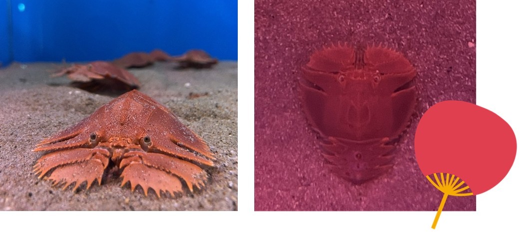 ウチワエビは写真のように平たい体をしており、体の前半分は円盤状になっています。その姿がまるで団扇(うちわ)のように見えることが名前の由来です。