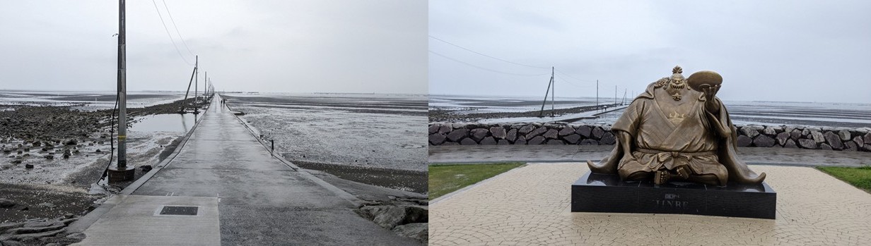 近くの有明海に面した住吉海岸公園には、インスタ映えする絶景スポットとして有名な長部田海床路(漁業従事者のため、干潟に作られた約1kmのコンクリート製の道路。満潮時には水没)があるようなので、雨模様でしたがちょうど干潮時で道路が出ていたので先端まで歩いてから次の目的地の熊本城に向かいました。