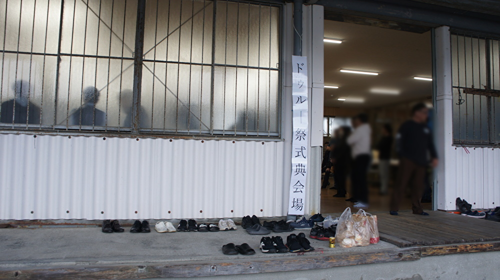 会場は組合事務所に併設された集会施設のような建物で、すでに多くの関係者(約120名)が集まっており、まさに式典が始まるところでした。神事とのことでしたので、会場内への立ち入りは控え、開放されている扉の外から見学させていただきました。