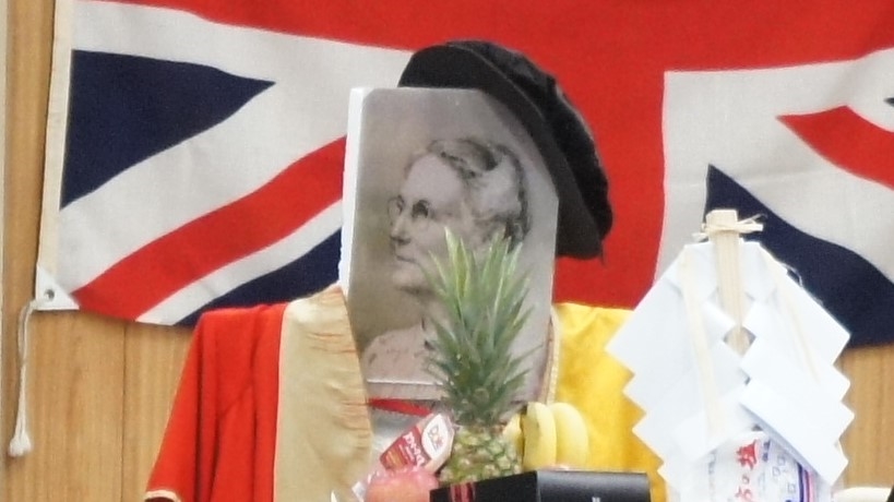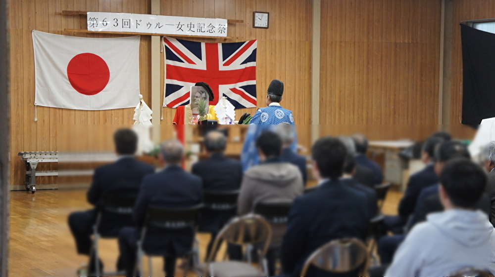 先ほど見学した記念碑は、1963年(昭和38年)4月14日に建立・除幕され、翌年から同日に「ドゥルー女史記念祭」として顕彰が始まり、今年で63回目を迎えます。祭壇の後方には日本と、ドリュー博士の母国であるイギリスの国旗が掲げられ、祭壇には博士の写真が飾られていました。